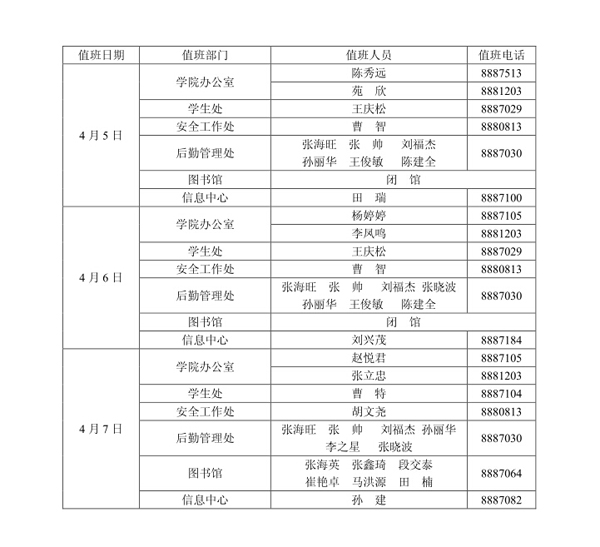北京交通大学海滨学院行政值班表(4月)