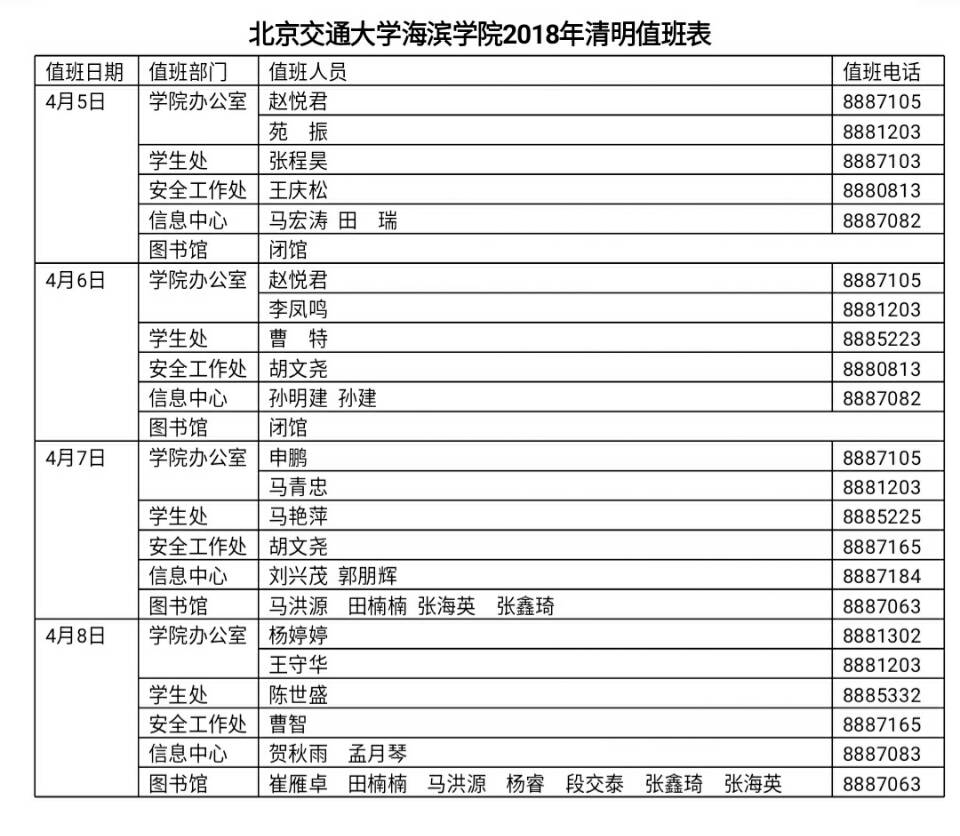 北京交通大学海滨学院2018年清明值班表