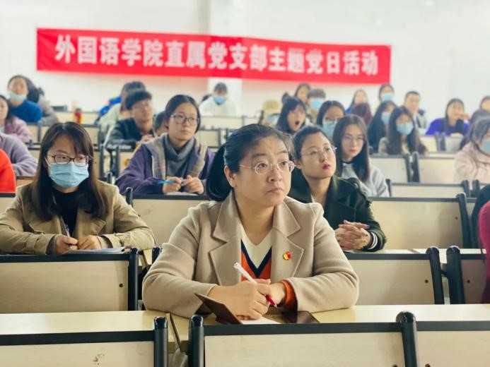 为强化党员干部服务意识,加强政治修养,树牢“四个意识”,Beat365外国语学院直属党支部于11月12日下午在知行楼A106开展以“在新时代、新工科、新文科、新外语的创新语境中,高校师生党员和入党积极分子如何发挥自己的先锋模范作用”为主题的党日活动,外国语学院院长张军学,副院长、直属党支部书记张丽,外国语学院23名师生党员和56名入党积极分子参加。本次活动由外国语学院直属党支部副书记周志慧主持。