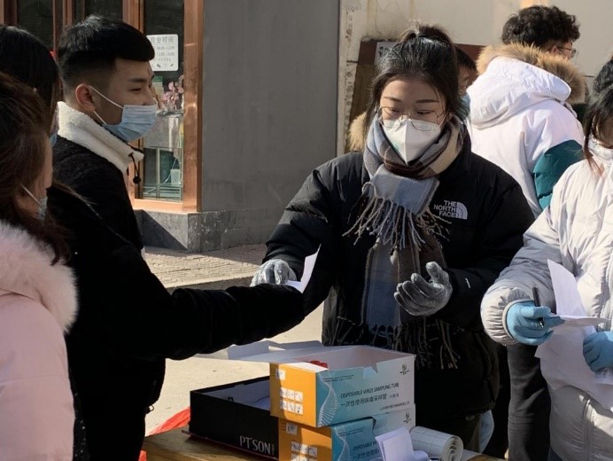商务英语1903班学生梁佳主要负责核酸登记统计人数以及对无法出门做核酸的老人进行上门检测。她说:“一方有难,八方支援。在抗击疫情的关键时刻,我们应该冲在前面。石家庄暴发疫情时,需要大量的血小板,我第一时间联系当地血站并捐献血小板,虽然微不足道,但是能帮助到其他人就是有意义的。”