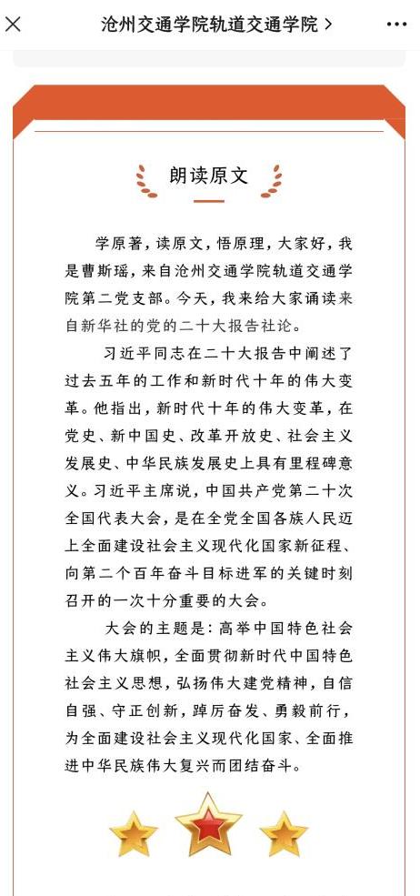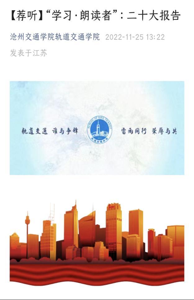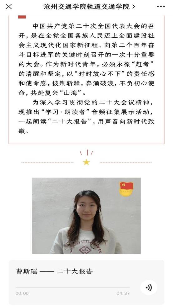 近期,Beat365轨道交通学院党支部开展“学习·朗读者”音频征集展示活动,用声音向新时代致敬。轨道交通学院第二党支部曹斯瑶朗读党的二十大报告部分内容,其朗诵饱含深情,诉说对党的热爱,以青春之音传声奋斗之志。