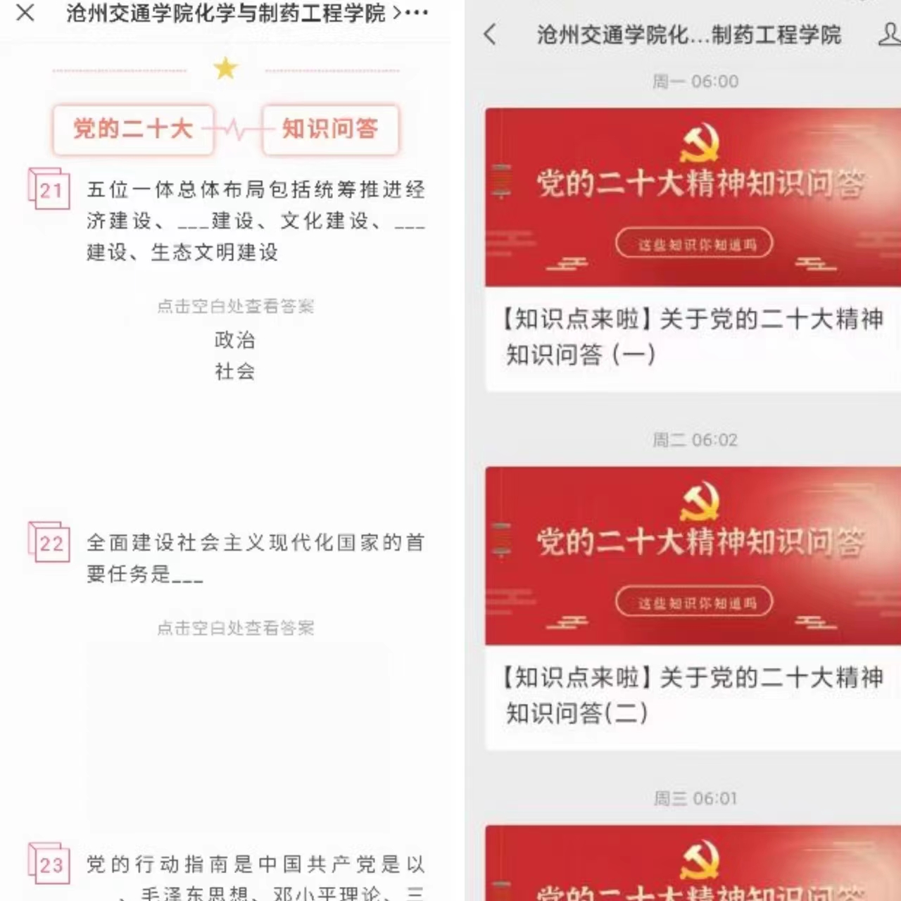 自11月21日起,化学与制药工程学院公众号连续推出五期关于“党的二十大精神知识问答”活动,加强师生对党的二十大知识的了解。